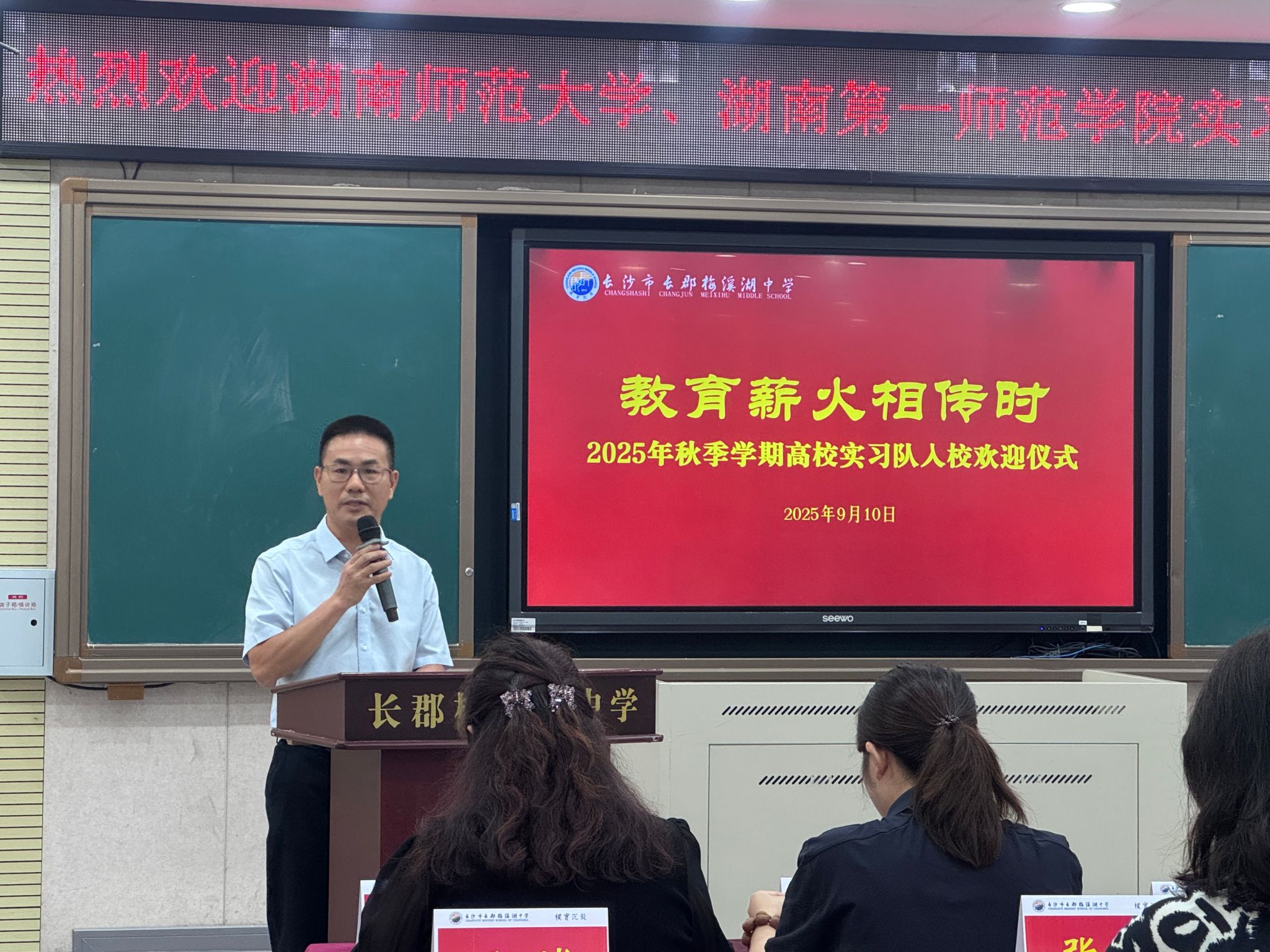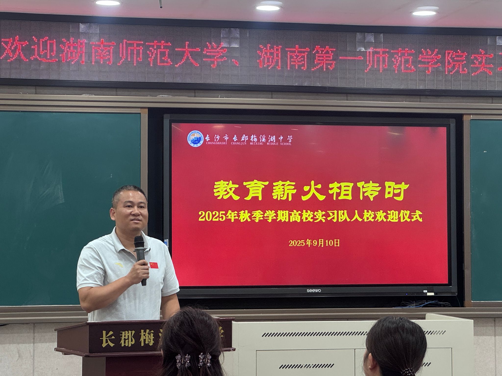 长郡梅溪湖中学校长在欢迎仪式上发表致辞,他对两所高校实习队的到来表示诚挚欢迎,向全体实习教师致以节日祝福,并介绍了学校的办学理念、育人特色与教学成果。他强调,教育是一场接力赛,实习教师的加入为学校注入了新鲜血液,希望大家能珍惜实践机会,在教学一线虚心学习、积极探索、将理论知识转化为教学能力,真正实现“教学相长,薪火赓续”。