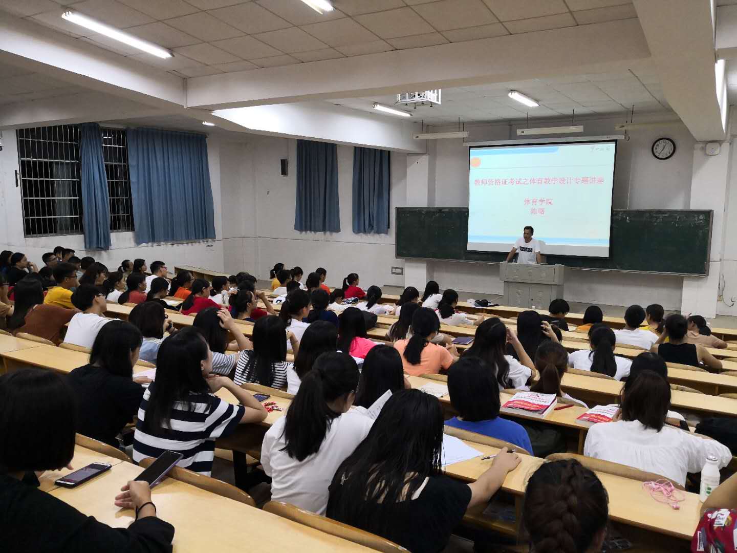 陈教授结合多年的实践教学经验与研究成果,理论联系实际,从教学目标、教学重难点、教学方法、教学步骤与时间分配等环节阐述了体育课程教学设计的具体内容,每讲到一处知识点,便结合实际教学案例进行分析,并且运用了大量生动的视频材料,讲座内容新颖、语言幽默,现场气氛活跃,为同学们呈现了一堂生动而实用的讲座,得到了同学们的一致好评,同时,也极大地鼓舞了同学们的士气,增强了同学们应考的自信心。