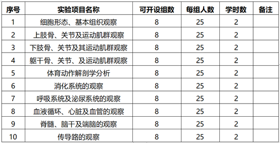 运动解剖实验室实验项目一览表