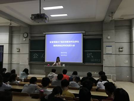 举行了2017级体育教育专业教师资格证考试动员大会及教师资格证备考经验交流大会。教科办周莎老师、辅导员朱慕雅老师以及2017级全体学生参加了此次活动。