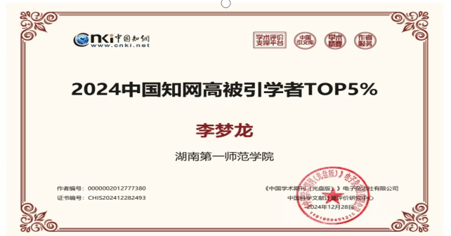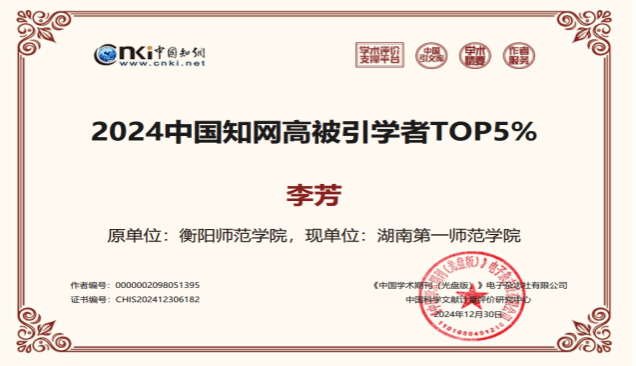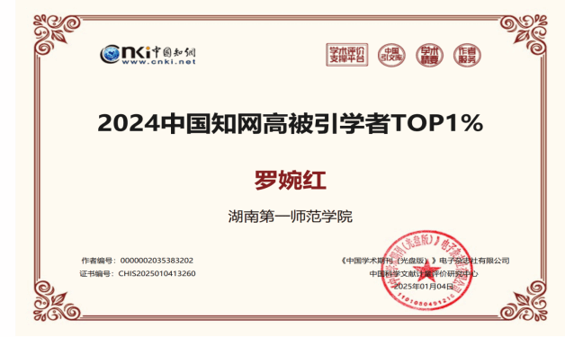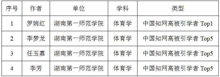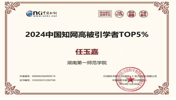 近日,中国知网中国科学文献计量评价研究中心(简称“知网评价中心”)基于中国知网收录的国内学术期刊论文和会议论文,首次开展学者学术影响力客观评价,麻豆视频 共4名教师入选2024中国知网高被引学者Top1%、Top5%,入选教师总人数位居湖南省高校体育学科前列。