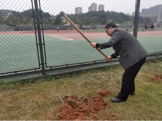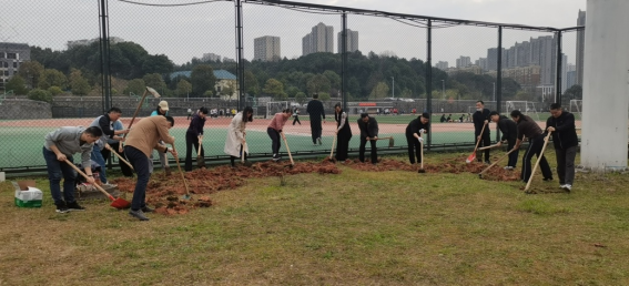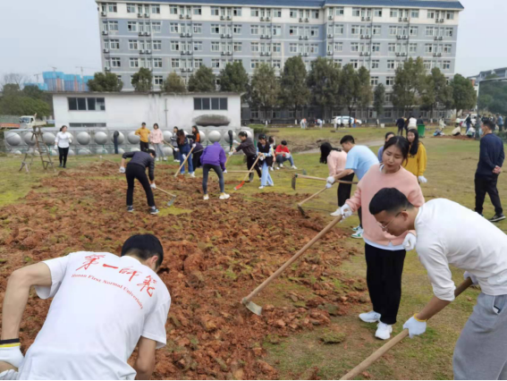 教师党员和学生党员分成两组,师生同场竞赛——教师党员在党委书记谢培松、副书记朱建伟的带领下,动作规范地扬锄挥铲,把三尺讲台上培“桃”育“李”的精气神播撒在宽广校园的绿色大地上,学生党员不甘落后,在青春飞扬中认真专注地挖土、松根、择梗,欲与老师试比高。
