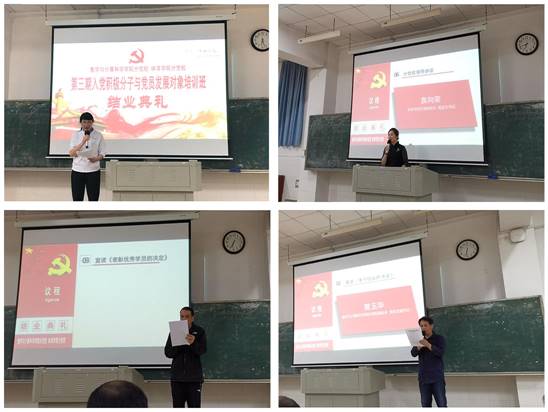 分党校、数学与计算科学学院分党校联合举办的第三期入党积极分子与党员发展对象培训班结业典礼在玉衡楼南栋101隆重举行,两院分党校及学院领导袁向荣、黄依柱、祝娅、纪鑫及欧阳章东、曾玉华、成夏炎出席,全体学员及两院学生党支部、团总支组织部的工作人员参加了典礼。典礼由数学与计算科学学院分党校校长、党总支书记赵花云主持。