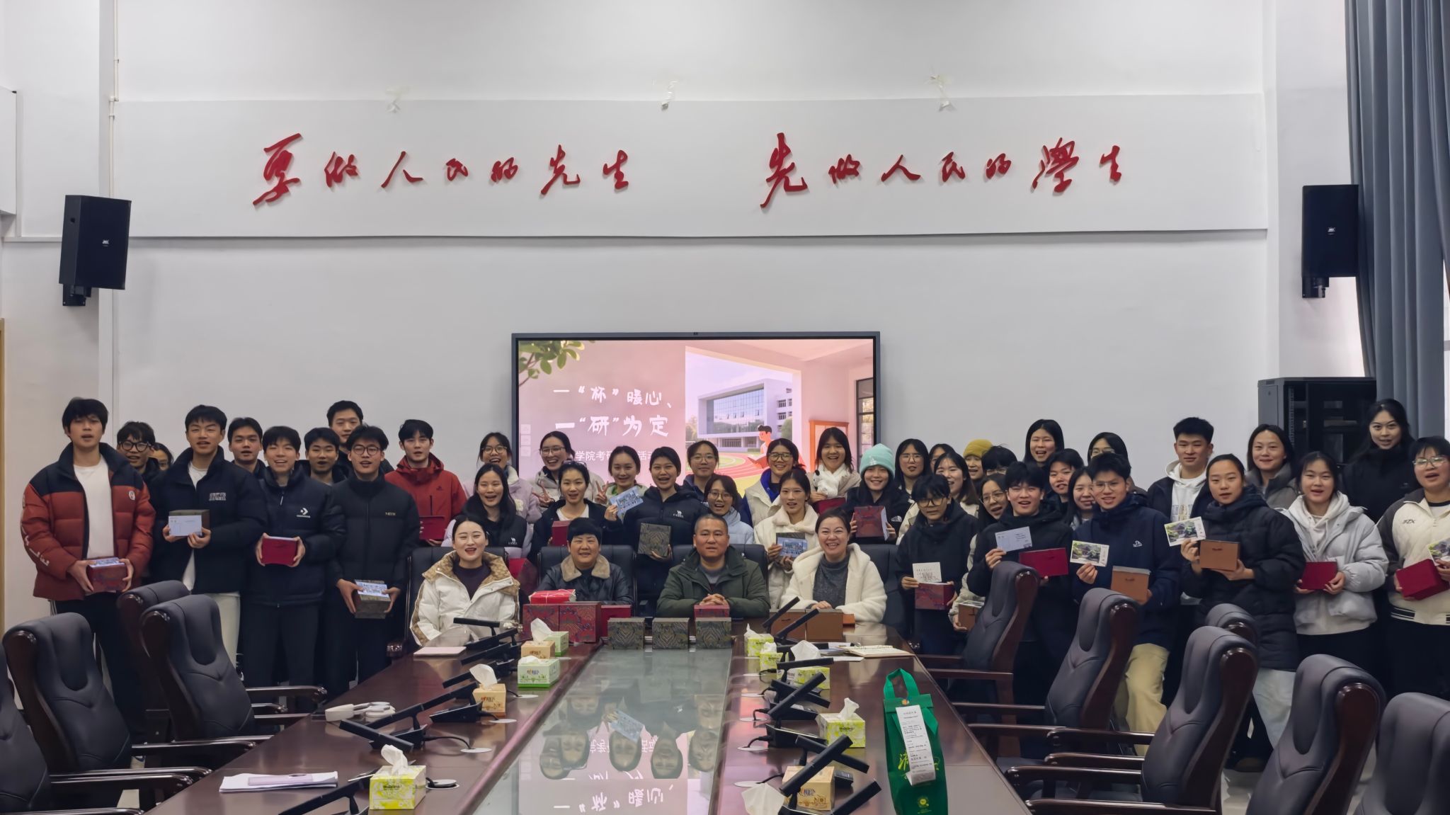 在温馨的氛围中,学院领导和老师为考研学子们送上了精心准备的文创定制马克杯及考研祝福明信片。每一只马克杯都承载着学院的关怀与祝福,每一张明信片都写满了师长的鼓励与期许。同学们手持礼物,脸上洋溢着感动与喜悦,现场掌声与笑声交织,温暖与感动在师生间传递。