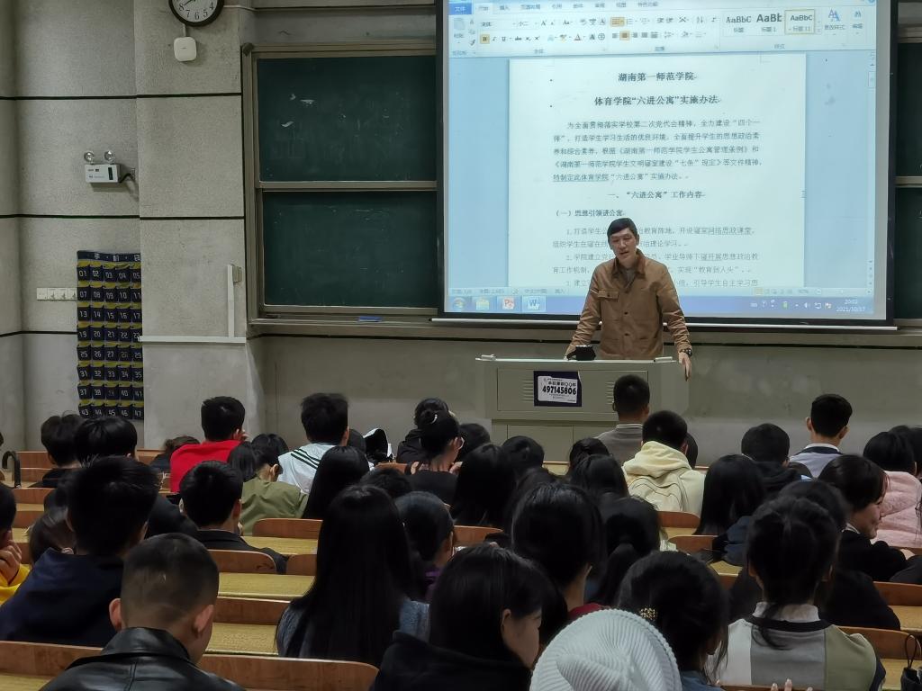 首先,纪鑫老师强调了寝室长的重要性,提出了“六进公寓”的实施方法,强调工作内容:“思想引领进公寓、文明修养进公寓、优良学风进公寓、心理辅导进公寓、党团组织进公寓、自我管理进公寓。”表示要从寝室长开始带动寝室同学,打造一个作风、纪律、习惯优良的寝室。