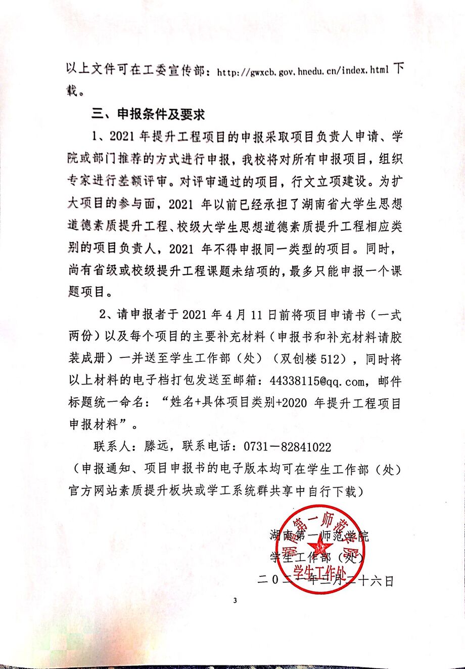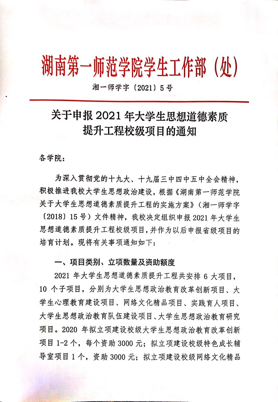 关于申报2021年大学生思想道德素质提升工程校级项目的通知