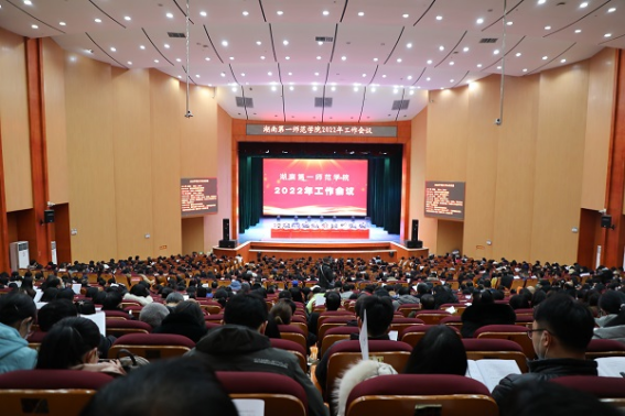 在东方红校区田汉剧院召开了学校教职工大会。校党委书记罗成翼作了题为“对标对表攻坚克难 群策群力兴我一师 以实干实绩迎接党的二十大胜利召开”的工作报告。罗成翼书记对标申硕,对标“一四”战略目标,部署了2022年工作要点,对全校教职工进行了动员。同时为贯彻学校第二次党代会精神,全面推进“四个一师”建设,切实推动“十四五”事业规划落实,学校明确了各个二级学院2022年关键核心指标目标。