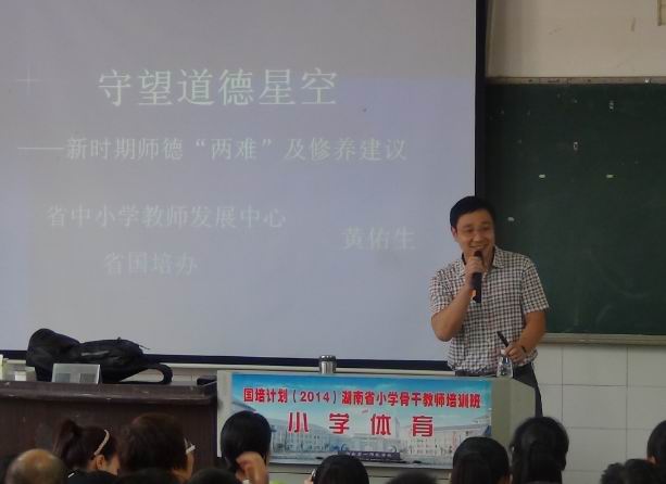 9月3日下午,湖南师范大学兼职教授、湖南省国培办黄佑生主任,在文B103作题为《守望道德星空——新时期师德境界与践行策略》的讲座,生动、系统的诠释了教师道德的内涵。