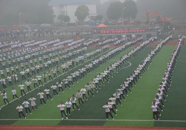 2011、2012、2013级全体同学分别表演了第九套广播体操、“七彩阳光”少儿广播体操和武术操。表演队伍阵容庞大,精神抖擞,动作整齐划一,一副美丽的精灵画卷呈现在全体观众面前。