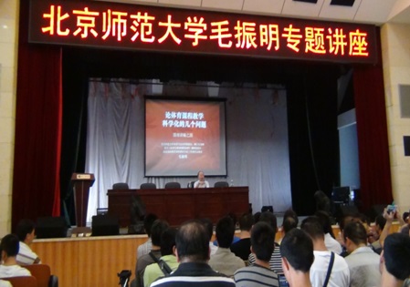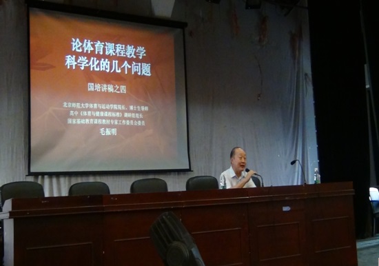 师生等300多人作了题为《当前体育课程教学基本问题》的专题讲座。毛教授现担任我国中小学《体育与健康课程标准》调研组组长,国家基础教育课程教材专家工作委员会委员。讲座中,毛教授分析了当前体育课质量与标准问题、锻炼的方法与实效问题、学生的发展与教育问题、体育教学与安全的问题、教学条件的改善及善用问题、体育教师的专业化问题等,并列举实例诠释这些问题。 整堂讲座声情并茂,风趣幽默,深入浅出,通俗易懂,气氛热烈,内容详实,信息丰富,让大家开阔了眼界,活跃了思维,拓宽了视野,更新了理念,受益匪浅。讲座由体育系主任、体育学科首席专家黄依柱教授主持。
