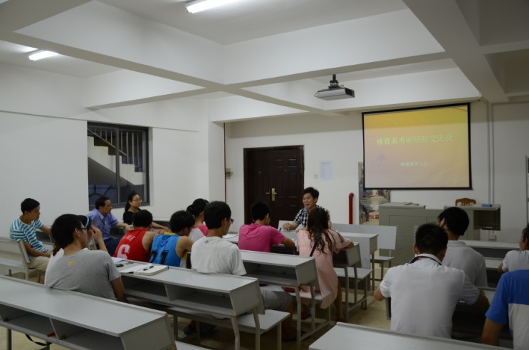 2013年5月28日由体育系学工办主办的考研交流会在体育馆多媒体教室举行。本次交流会体育系系主任黄依柱、党总支副书记祝娅、学工办主任纪鑫、学生辅导员唐智鹏出席了会议,并诚邀了今年以优异的成绩成功考研的2009级黄先瑜同学。会议由祝娅副书记主持。