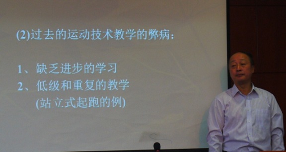 师生作题为《如何上好一节体育课》的专题讲座,毛教授首先指出了为什么要强调教体育课的上法问题、当今体育课存在的问题以及如何对待这些问题;其次是明确了体育课应完成什么任务;第三是指出了一节好的体育课的标准,并用一些实例做了说明。整个讲座深入浅出,通俗易懂,让大家深受启发。