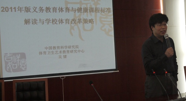 10月20日下午,中国教育科学研究院吴健研究员作题为《2011年版义务教育体育与健康课程标准解读与学校体育改革策略》的专题讲座,使大家更加深刻地了解到中央及各级行政部门对儿童体质健康、学校体育工作重视,让我们对自己所从事的体育事业增加了信心,同时也深感自己的责任重大,并重新认识了“健康第一”的指导思想的深刻内涵。