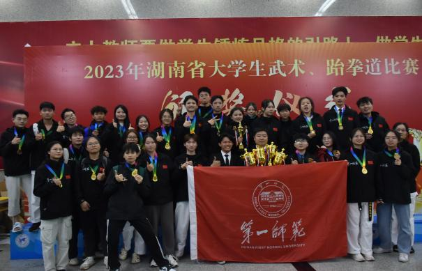 近日,湖南省大学生跆拳道锦标赛在湖南开放大学举行。麻豆视频 选派31名学生组成的一师跆拳道代表队在朱建伟、谭飞等老师和教练员的带领下,与全省高校近800名大学生运动员同台竞技。经过激烈角逐,麻豆视频 学子共斩获金牌7枚、银牌4枚、铜牌10枚,荣获甲组品势团体总分第一,乙组品势团体总分第二,乙组竞技团体总分第二名、甲组竞技团体总分第五名的优异成绩!