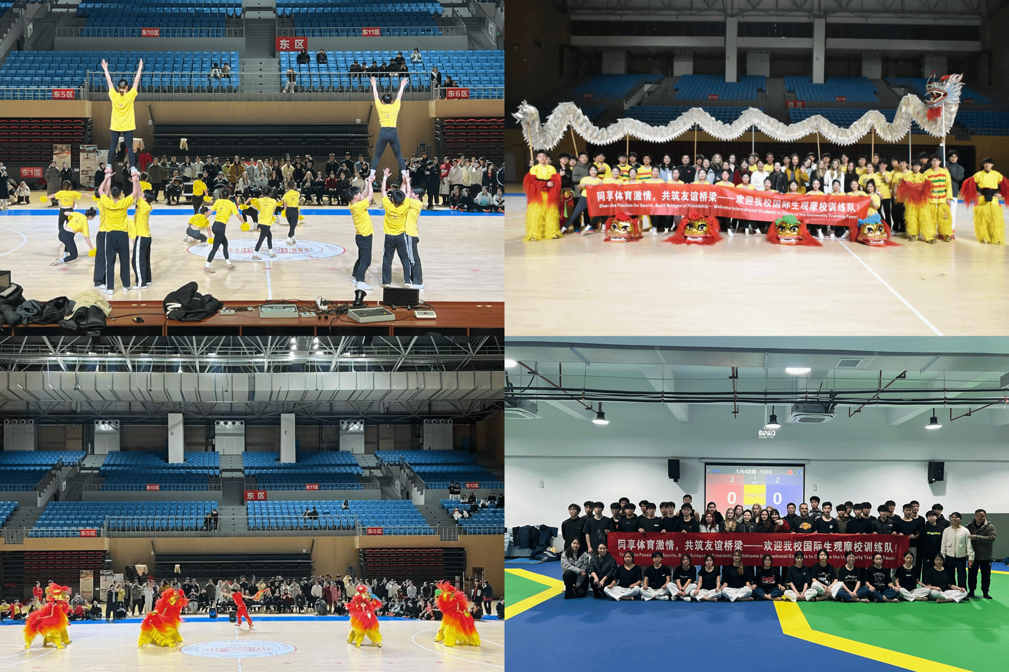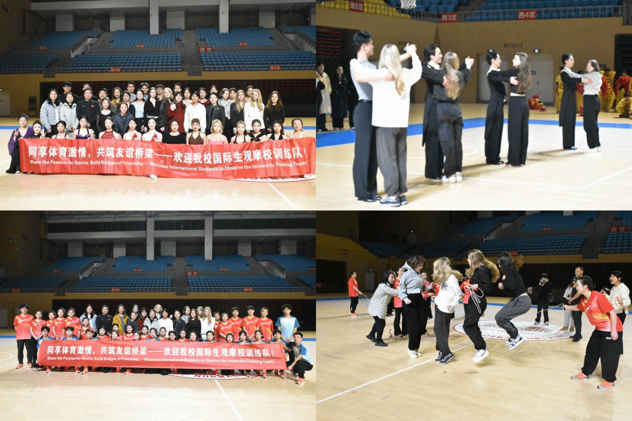 在国际学生抵达新体育馆篮球场后,首先观摩了丁小芬老师指导的拉丁舞队与摩登舞队表演,学生们在丁小芬老师带领下体验慢三舞步基础动作,随后观看由刘丽老师带领的花样跳绳队所展示的单人交叉跳、双人同步跳等十余种创新跳法,国际学生踊跃参与互动环节。活动依次呈现了罗婕老师编排的健美操啦啦操表演、崔建彪老师指导的舞龙舞狮传统技艺展演,最后全体移步新体育馆二楼,观赏谭飞教练执教的跆拳道队竞技对抗训练。