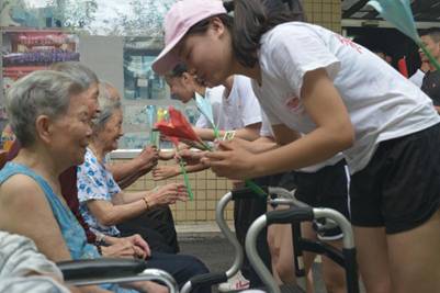 随后,学生党员代表为老兵们表演了精心准备的武术、健美操、拉丁舞节目,送上亲手做的手工花和亲笔书写的祝福卡,以表达他们对老兵的崇敬之情。当教师党员代表将一箱箱牛奶和饮料送到老兵跟前,并祝福他们健康长寿时,老兵们情不自禁地举起右手颤颤巍巍地行着军礼。在深情的握手及温暖的拥抱中,老兵们感动得眼角泛着泪花。