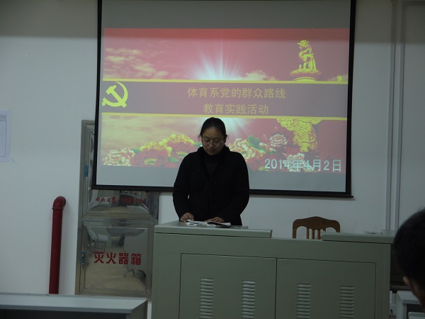2014年4月2日下午2:00,体育系系党总支在体育训练馆二楼会议室召开全体党员大会,开展党的群众路线教育实践活动专题学习活动。系党总支副书记祝娅主持会议并作学习宣讲,全体党员师生认真听取并参加学习。