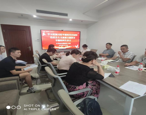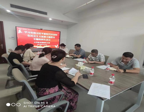 大学体育教师党支部学习贯彻习近平新时代中国特色社会主义思想主题教育专题组织生活会,与支部党员同志一起学习检视、谈心交流。